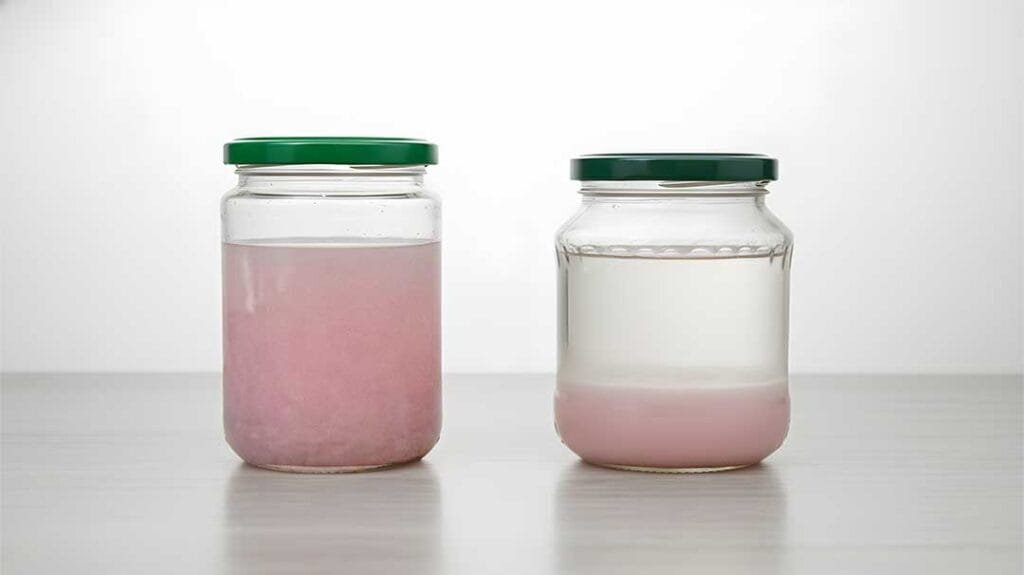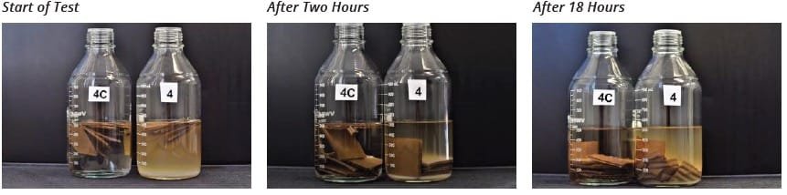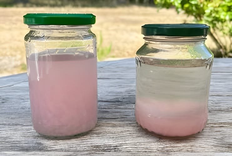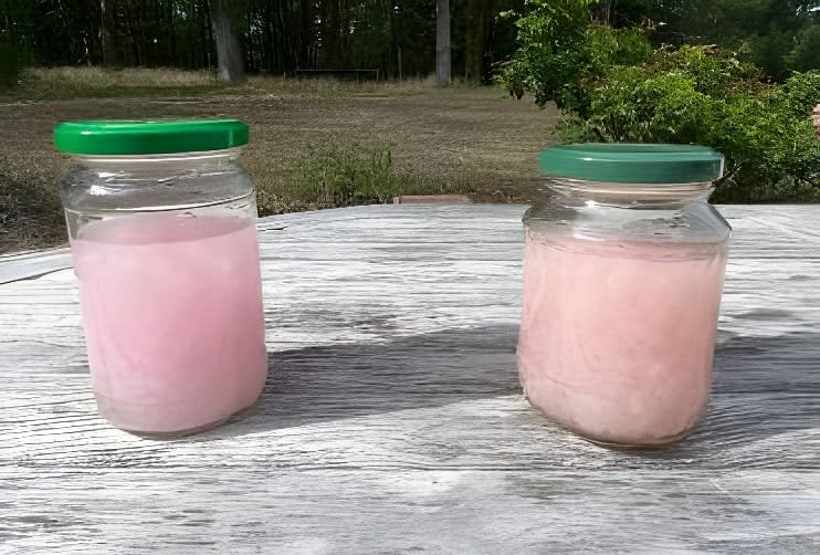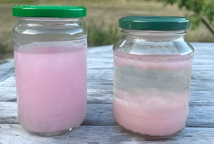Se realizó una prueba en frascos con agua que contenían cuatro hojas de papel higiénico rosa cada uno. Se añadió una cucharadita de PAPERATOR™ al frasco de la derecha. Los frascos se dejaron durante la noche. Al día siguiente, el frasco tratado con PAPERATOR™ mostró agua significativamente más clara y con una mayor digestión del papel que el agua restante en el frasco sin tratar.